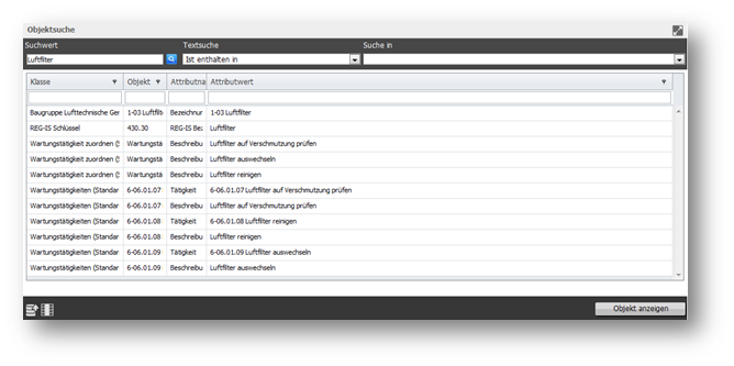 Dazu kann in dem Feld Suchwert ein Begriff eingegeben werden, der dann, durch einen Klick auf die Lupe, in allen Objektdaten gesucht wird. Mit Hilfe des Feldes Textsuche kann eingestellt werden, wo sich der gesuchte Begriff innerhalb einer Begrifflichkeit befindet. Die verfügbaren Optionen sind beginnend mit, ist enthalten in, endet mit, Genau gleich oder auch mit einem Stern (*) als selbstdefiniertem Wildcard.