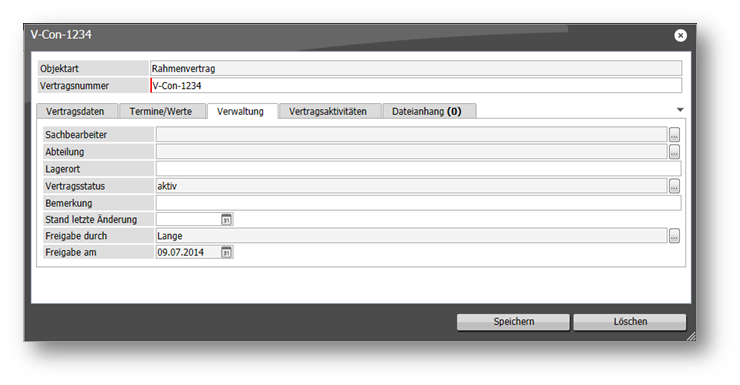 Der Nutzer hat hier lediglich die Möglichkeit die Verträge einzusehen (ReadOnly-Modus), zu prüfen und freizugeben. Wird der Vertrag freigegeben, wird das Feld Vertragsstatus auf aktiv gesetzt, das Feld Freigabe durch auf den angemeldeten Benutzer und das Feld Freigabe am auf das aktuelle Datum gesetzt.